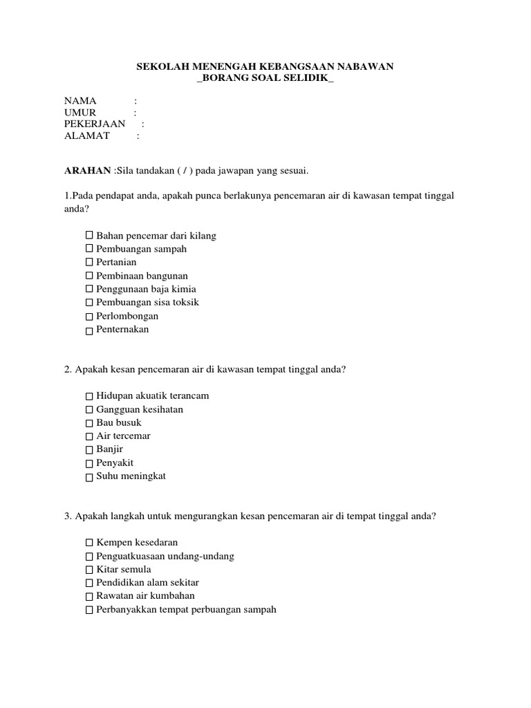 Contoh Soalan Soal Selidik Tentang Pencemaran Sungai
